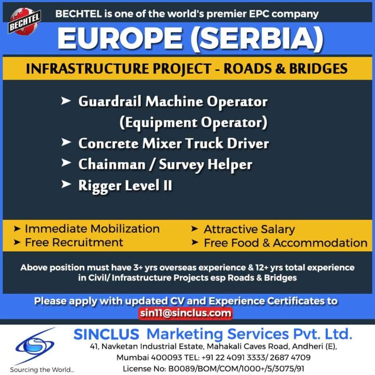 BECHTEL is one of the world’s premier EPC companyEUROPE (SERBIA)INFRASTRUCTURE PROJECT – ROADS & BRIDGESGuardrail Machine Operator(Equipment Operator)Concrete Mixer Truck …