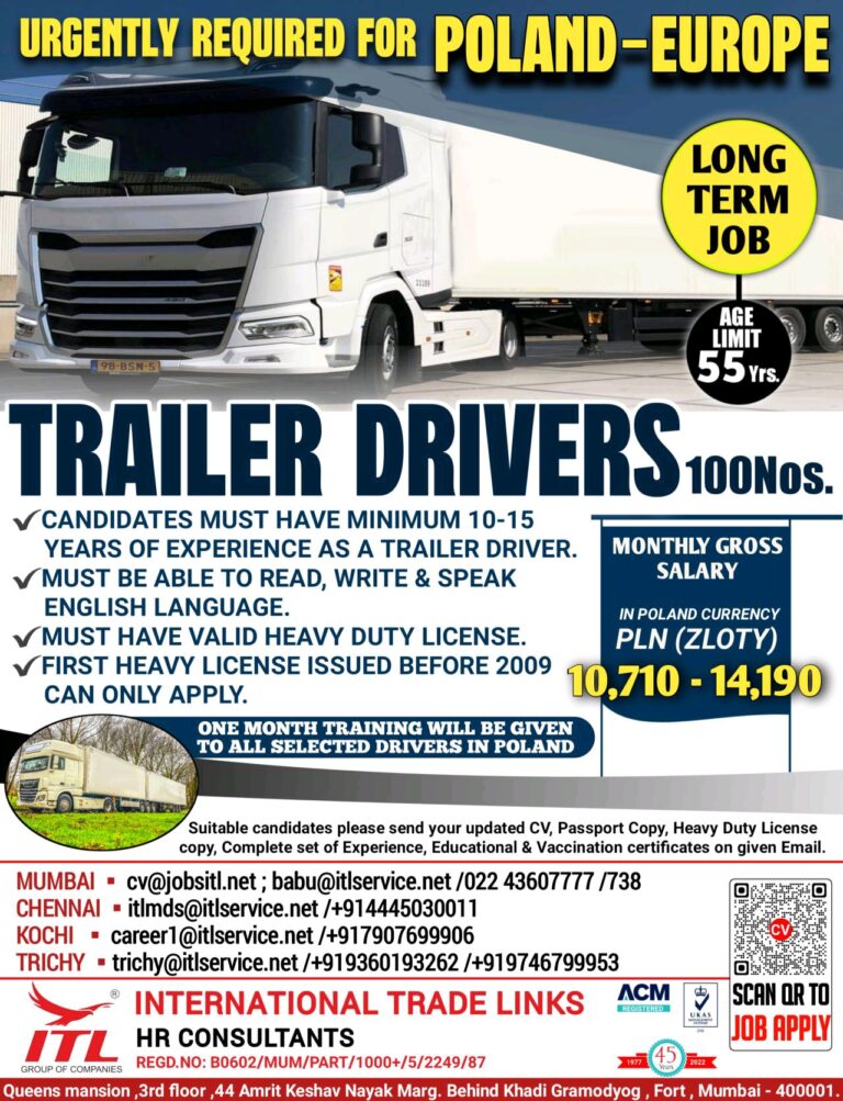 TRAILER DRIVERS100Nos.VCANDIDATES MUST HAVE MINIMUM 10-15MONTHLY GROSSYEARS OF EXPERIENCE AS A TRAILER DRIVER.VMUST BE ABLE TO READ, WRITE & SPEAKENGLISH …