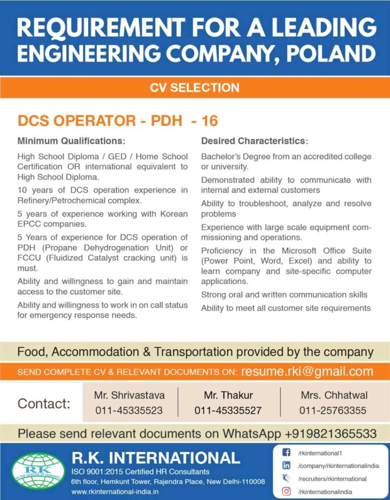 REQUIREMENT FOR A LEADINGENGINEERING COMPANY, POLANDCV SELECTIONDCS OPERATOR – PDH – 16Minimum Qualifications:Desired Characteristics:High School Diploma / GED / Home …