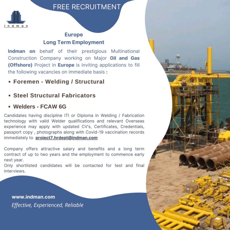 FREE RECRUITMENT EuropeLong Term EmploymentIndman on behalf of their prestigious MultinationalConstruction Company working on Major Oil and Gas(Offshore) Project in …