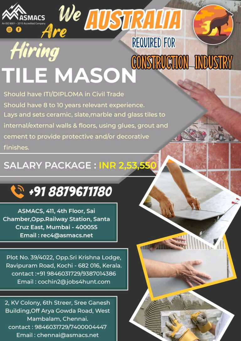 HiringTILE MASONShould have ITI/DIPLOMA in Civil TradeShould have 8 to 10 years relevant experience.Lays and sets ceramic, slate, marble and …