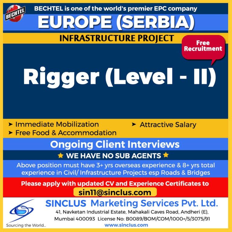 BECHTEL is one of the world’s premier EPC companyEUROPE (SERBIA)INFRASTRUCTURE PROJECT FreeRecruitmentRigger (Level – II)Immediate Mobilization➤ Free Food & AccommodationSourcing …