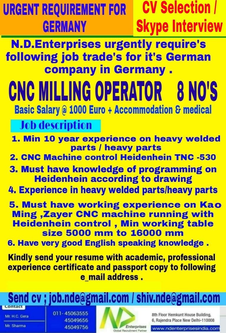 URGENT REQUIREMENT FOR CV Selection /GERMANY Skype InterviewN.D.Enterprises urgently require’sfollowing job trade’s for it’s Germancompany in Germany.CNC MILLING OPERATOR 8 …