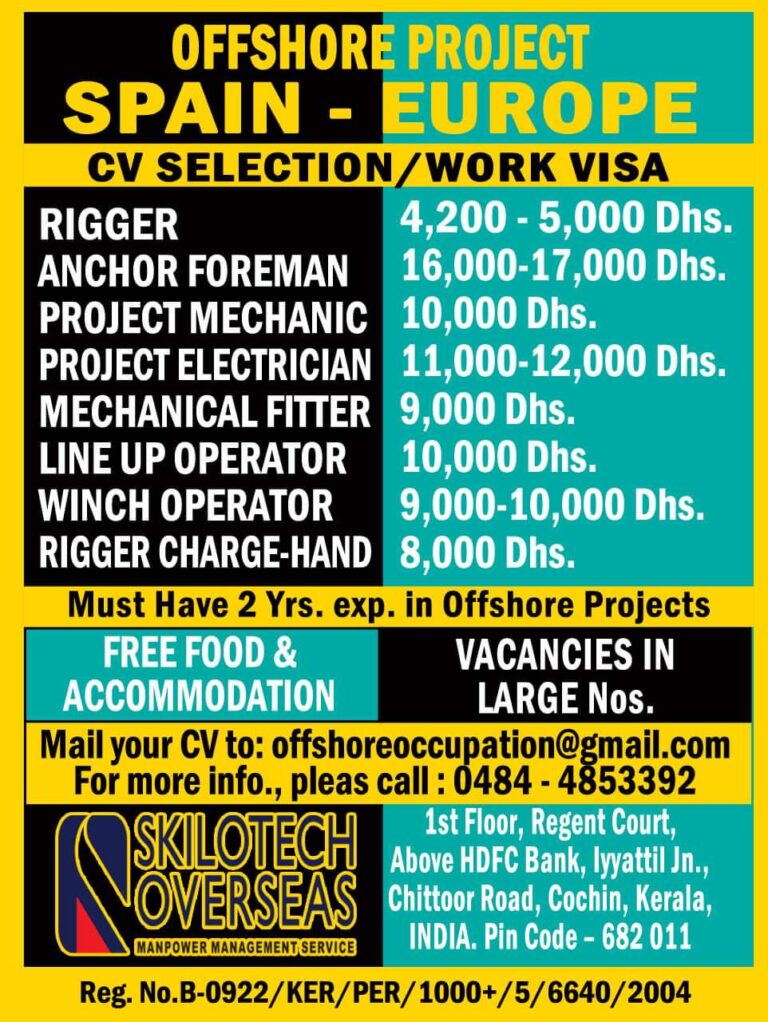 OFFSHORE PROJECTSPAIN – EUROPECV SELECTION/WORK VISARIGGER4,200 – 5,000 Dhs.ANCHOR FOREMAN 16,000-17,000 Dhs.PROJECT MECHANIC 10,000 Dhs.PROJECT ELECTRICIAN 11,000-12,000 Dhs.MECHANICAL FITTER 9,000 …