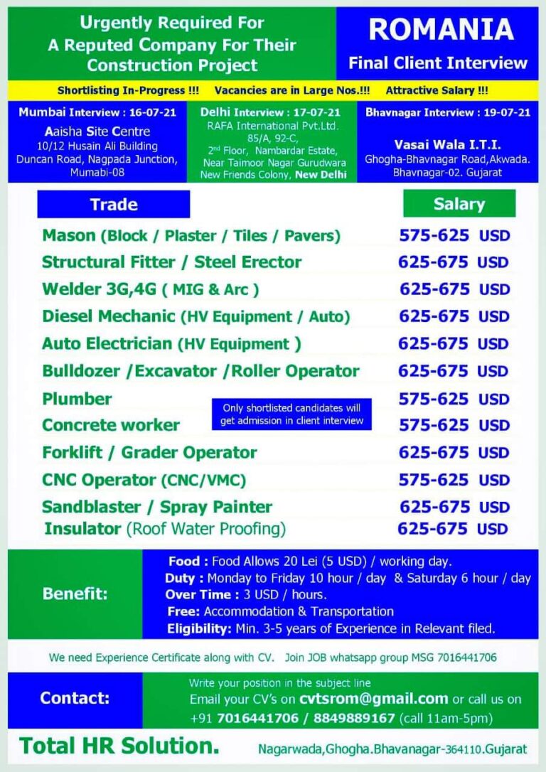 Urgently Required for ROMANIAA Reputed Company For TheirConstruction ProjectFinal Client InterviewShortlisting In-Progress !!! Vacancies are in Large Nos.!!! Attractive Salary …