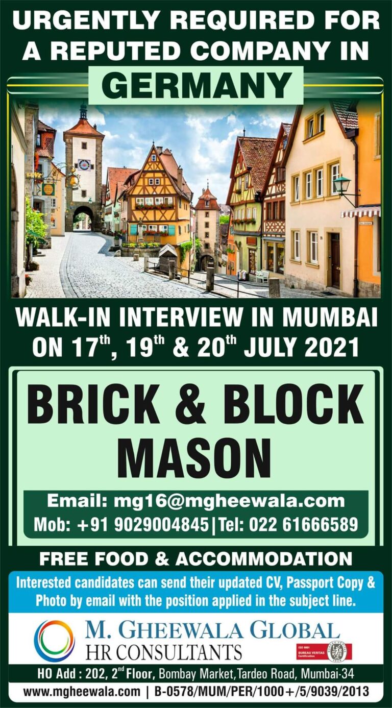 URGENTLY REQUIRED FORA REPUTED COMPANY IN GERMANYWALK-IN INTERVIEW IN MUMBAION 17th, 19th & 20th JULY 2021BRICK & BLOCKMASONEmail: mg 16@mgheewala.comMob: …