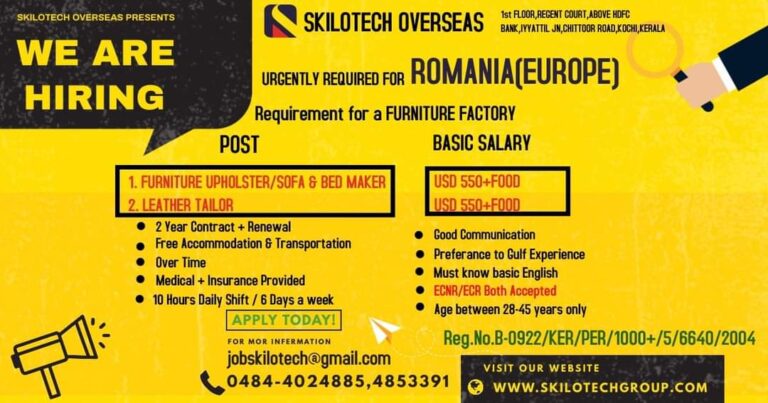 URGENTLY REQUIRED FOR ROMANIA(EUROPE)Requirement for a FURNITURE FACTORYPOSTBASIC SALARY FURNITURE UPHOLSTER/SOFA & BED MAKER USD 550+FOOD LEATHER TAILORUSD 550+FOOD• 2 …