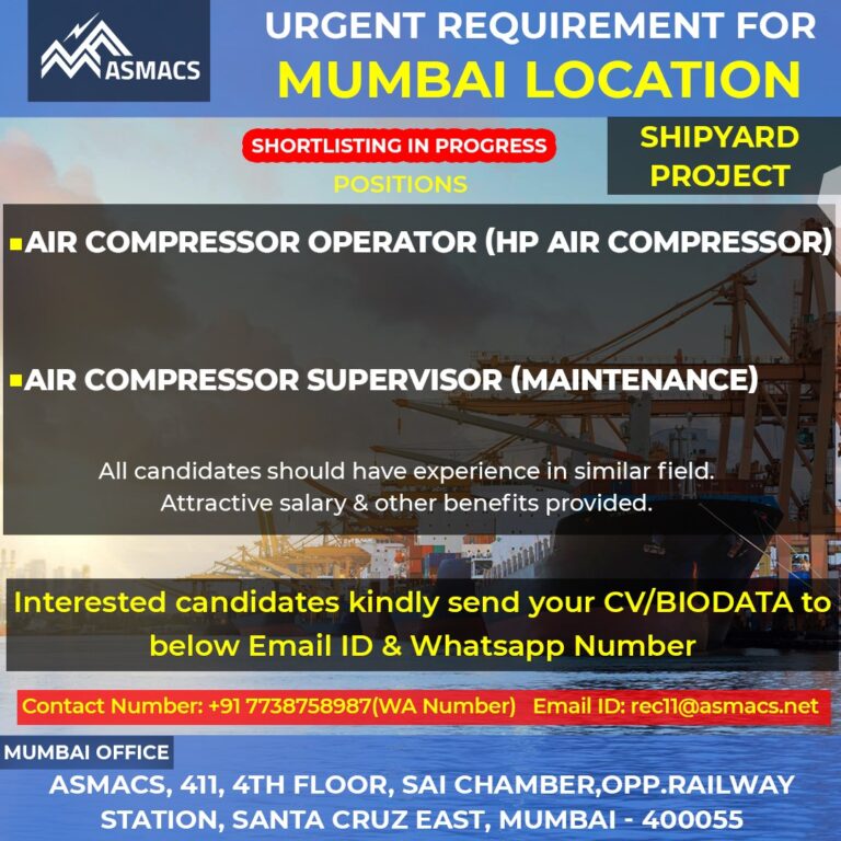 URGENT REQUIREMENT FORMUMBAI LOCATIONSHORTLISTING IN PROGRESSPOSITIONSSHIPYARDPROJECTAIR COMPRESSOR OPERATOR (HP AIR COMPRESSOR)-AIR COMPRESSOR SUPERVISOR (MAINTENANCE)All candidates should have experience in similar …