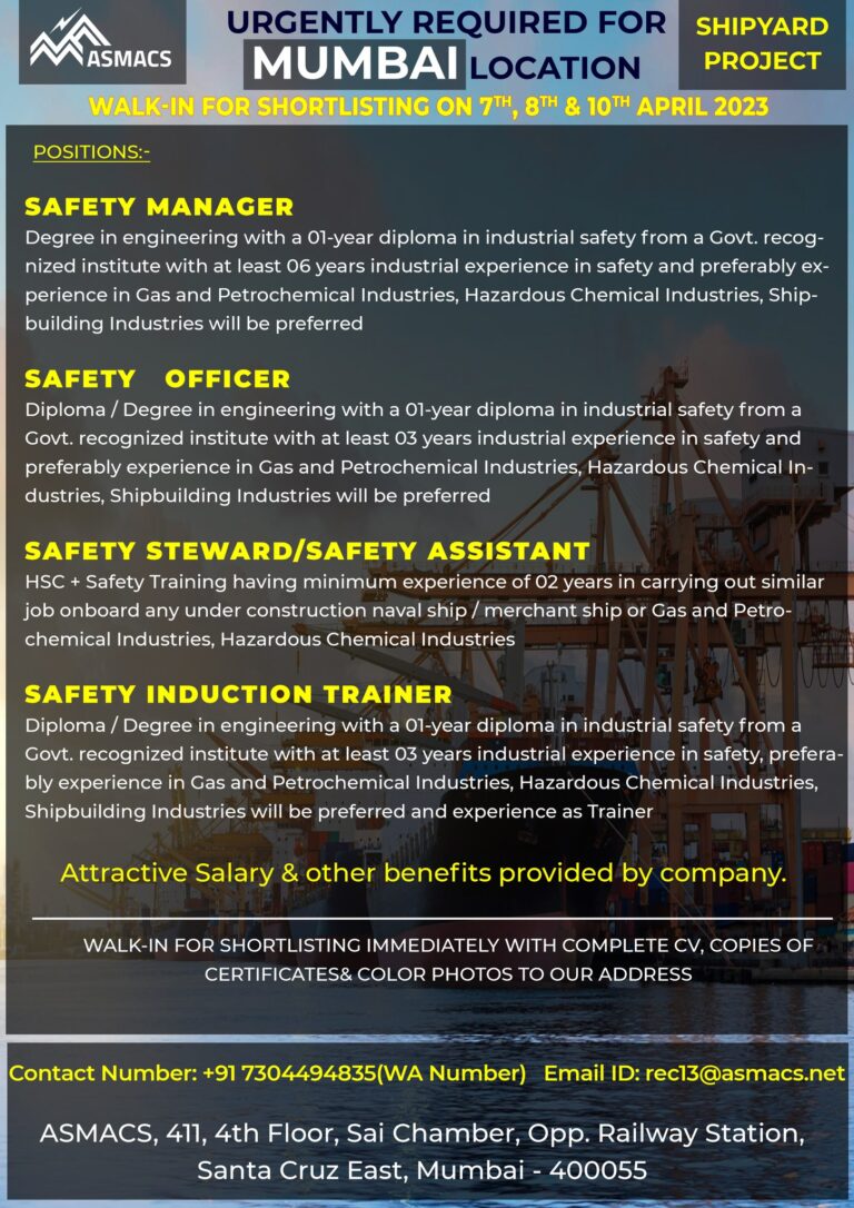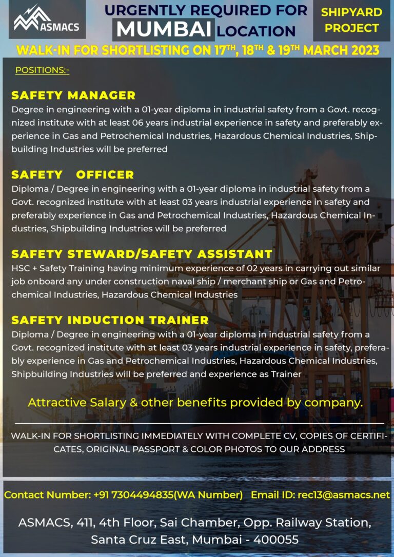 URGENTLY REQUIRED FOR SHIPYARDPROJECTMUMBAI LOCATIONWALK-IN FOR SHORTLISTING ON 17TH, 18TH & 19TH MARCH 2023POSITIONS:-SAFETY MANAGERDegree in engineering with a 01-year …