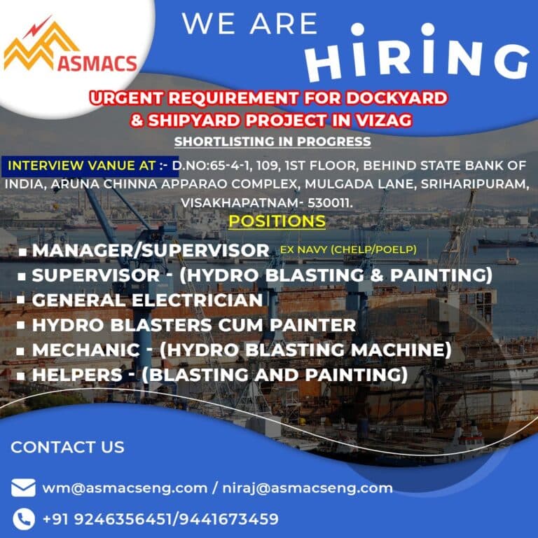 URGENT REQUIREMENT FOR DOCKYARD& SHIPYARD PROJECT IN VIZAGSHORTLISTING IN PROGRESSHIRINGINTERVIEW VANUE AT :-D.NO:65-4-1, 109, 1ST FLOOR, BEHIND STATE BANK OFINDIA, …