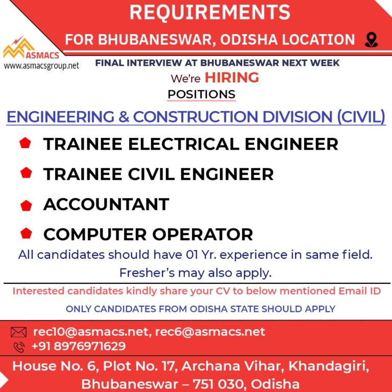 REQUIREMENTSFOR BHUBANESWAR, ODISHA LOCATION 9FINAL INTERVIEW AT BHUBANESWAR NEXT WEEKWe’re HIRINGPOSITIONSENGINEERING & CONSTRUCTION DIVISION (CIVIL)TRAINEE ELECTRICAL ENGINEERTRAINEE CIVIL ENGINEERASMACSwww.asmacsgroup.netACCOUNTANTCOMPUTER OPERATORAll …