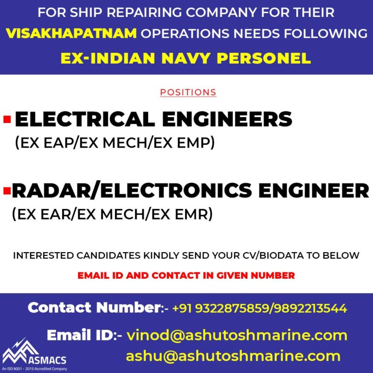FOR SHIP REPAIRING COMPANY FOR THEIR VISAKHAPATNAMOPERATIONS NEEDS FOLLOWINGEX-INDIAN NAVY PERSONELPOSITIONS-ELECTRICAL ENGINEERS(EX EAP/EX MECH/EX EMP)-RADAR/ELECTRONICS ENGINEER(EX EAR/EX MECH/EX EMR)INTERESTED CANDIDATES …