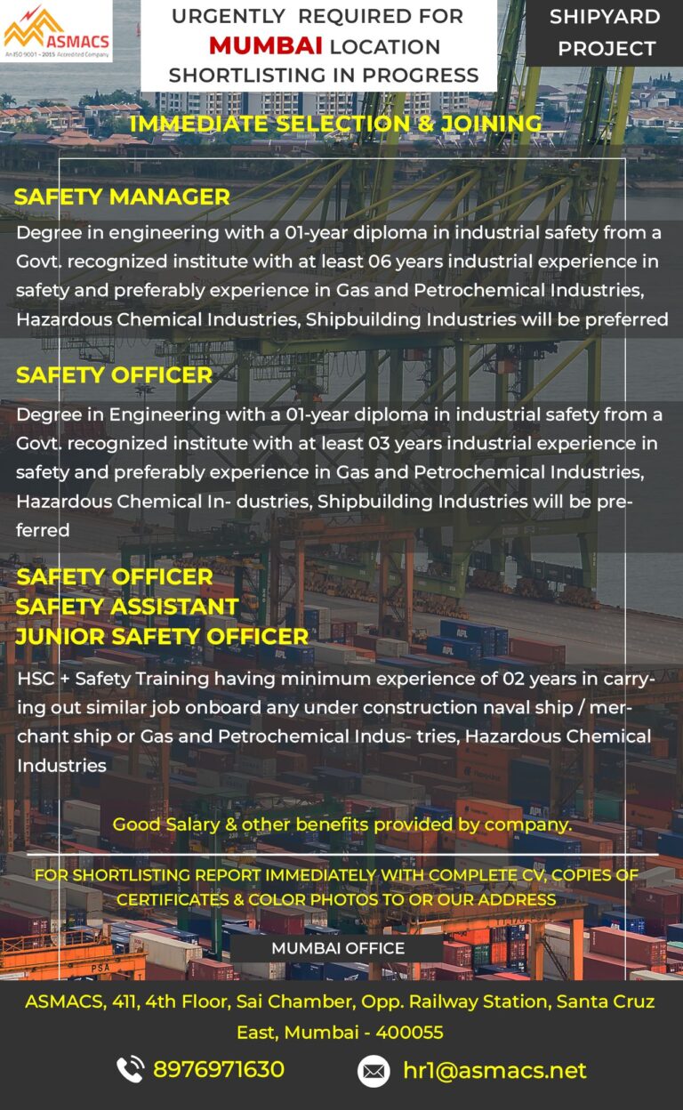 URGENTLY REQUIRED FOR SHIPYARDMUMBAI LOCATIONWALK-IN FOR SHORTLISTING ON 15TH, 16TH & 17TH APRIL 2023IMMEDIATE SELECTION & JOININGSAFETY MANAGERDegree in engineering …