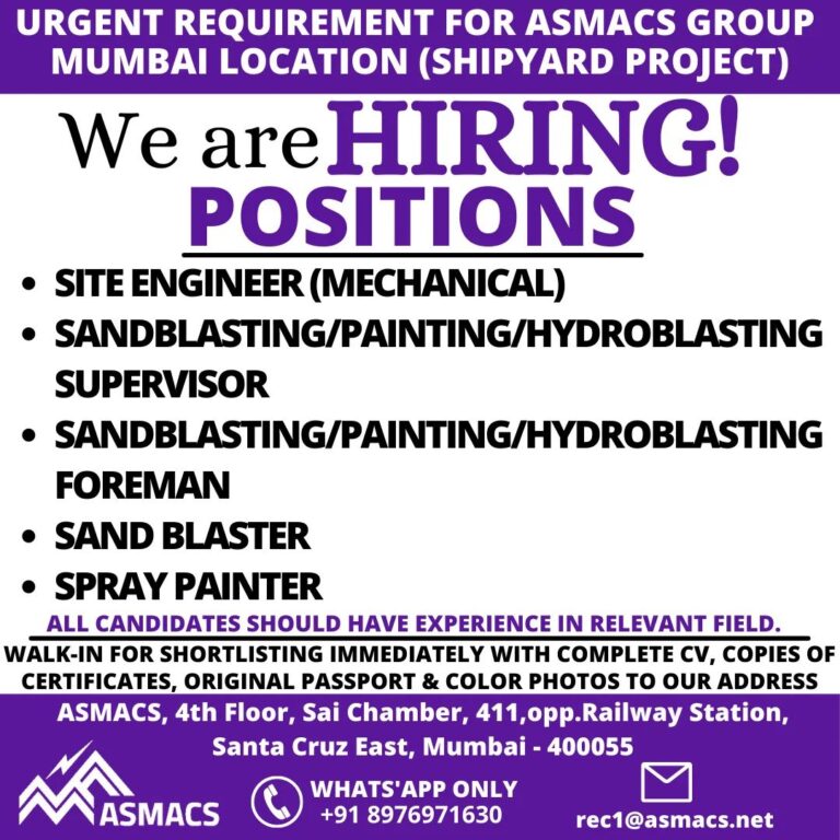 URGENT REQUIREMENT FOR ASMACS GROUPMUMBAI LOCATION (SHIPYARD PROJECT)We are HIRING!POSITIONS• SITE ENGINEER (MECHANICAL)• SANDBLASTING/PAINTING/HYDROBLASTINGSUPERVISOR• SANDBLASTING/PAINTING/HYDROBLASTINGFOREMAN• SAND BLASTER• SPRAY PAINTERALL CANDIDATES …