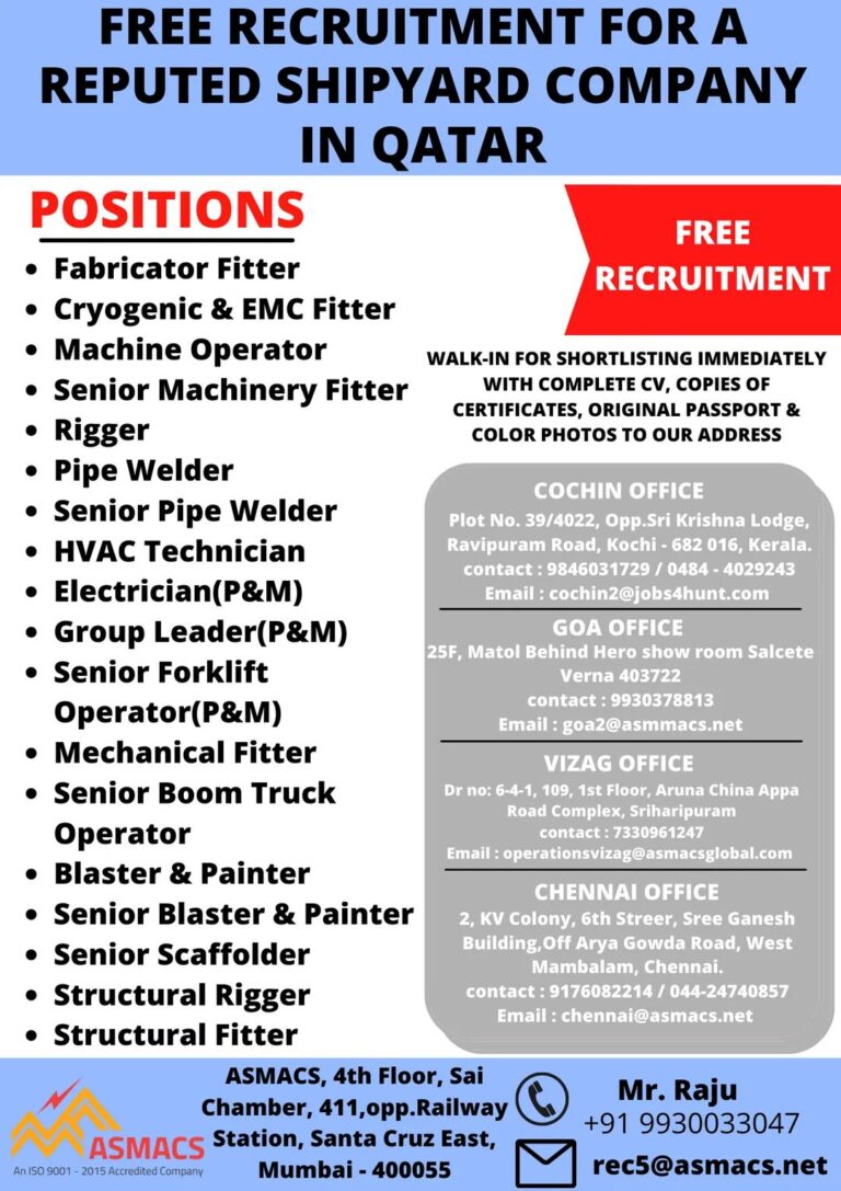 REPUTED SHIPYARD COMPANYIN QATARPOSITIONSFREERECRUITMENT• Fabricator Fitter• Cryogenic & EMC Fitter• Machine OperatorWALK-IN FOR SHORTLISTING IMMEDIATELY• Senior Machinery FitterWITH COMPLETE CV, …