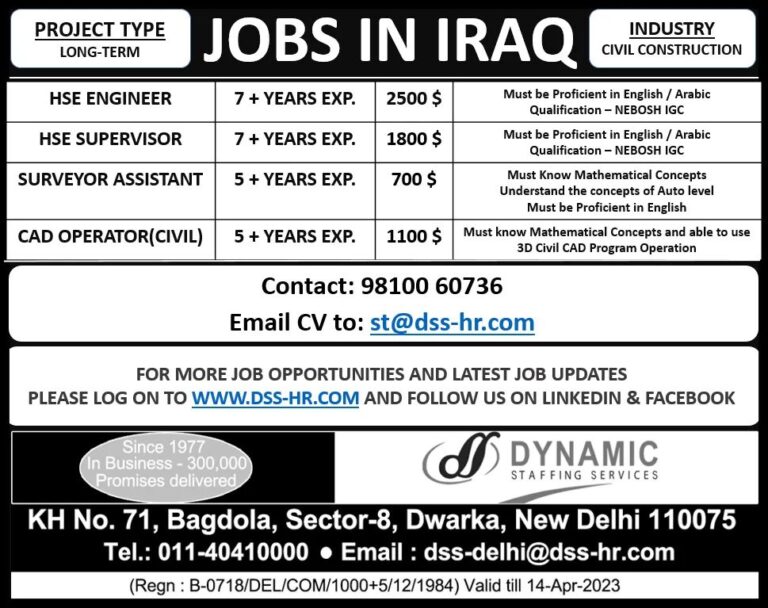 PROJECT TYPE JOBS IN IRAQINDUSTRYCIVIL CONSTRUCTIONHSE ENGINEER7 + YEARS EXP.2500 $Must be Proficient in English / ArabicQualification – NEBOSH IGCMust …