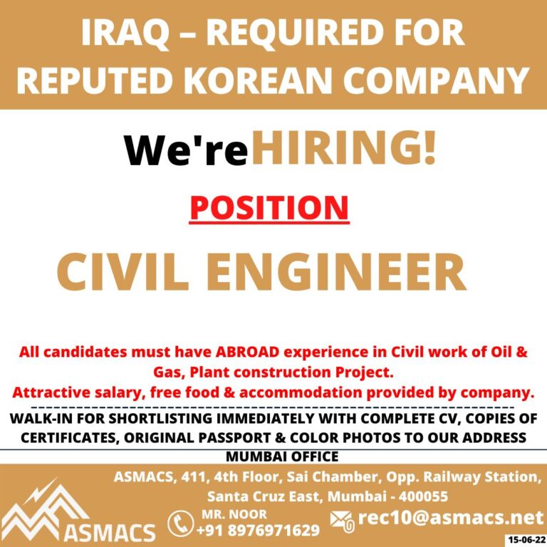 IRAQ – REQUIRED FORREPUTED KOREAN COMPANYHIRING!We’rePOSITIONCIVIL ENGINEERAll candidates must have ABROAD experience in Civil work of Oil &Gas, Plant construction …