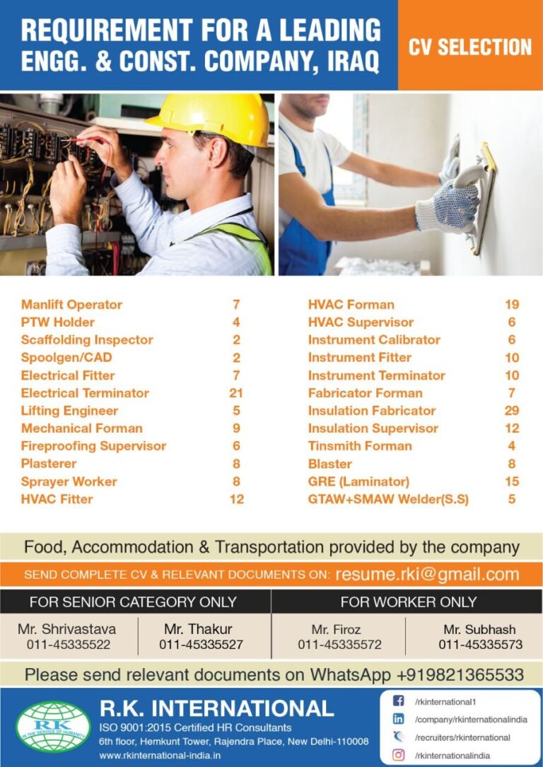 REQUIREMENT FOR A LEADINGENGG. & CONST. COMPANY, IRAQCV SELECTIONManlift OperatorPTW HolderScaffolding InspectorSpoolgen/CADElectrical FitterElectrical TerminatorLifting EngineerMechanical FormanFireproofing SupervisorPlastererSprayer WorkerHVAC FitterHVAC FormanHVAC …
