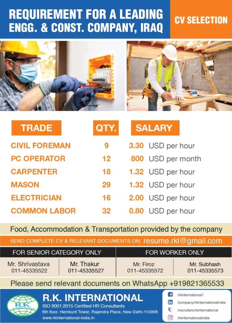 REQUIREMENT FOR A LEADINGENGG. & CONST. COMPANY, IRAQCV SELECTIONTRADECIVIL FOREMANPC OPERATORCARPENTERMASONELECTRICIANCOMMON LABORFood, Accommodation & Transportation provided by the companySEND POMPLETE …