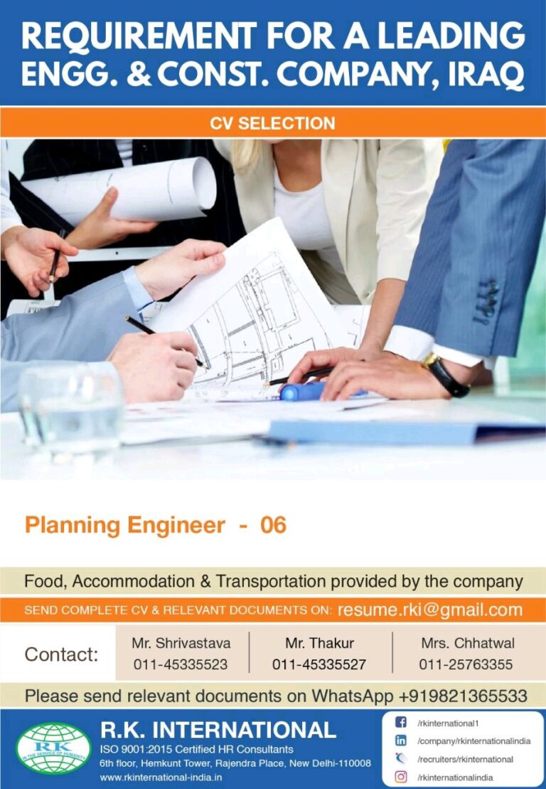 REQUIREMENT FOR A LEADINGENGG. & CONST. COMPANY, IRAQCV SELECTIONPlanning Engineer – 06Food, Accommodation & Transportation provided by the companySEND COMPLETE …