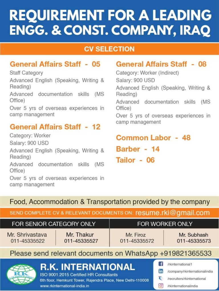 REQUIREMENT FOR A LEADINGENGG. & CONST. COMPANY, IRAQCV SELECTIONGeneral Affairs Staff – 05Staff CategoryAdvanced English (Speaking, Writing &Reading)Advanced documentation skills …