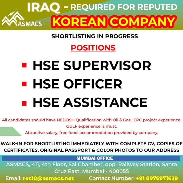 IRAQ – REQUIRED FOR REPUTED ASMACS KOREAN COMPANYSHORTLISTING IN PROGRESSPOSITIONS■ HSE SUPERVISOR■ HSE OFFICER■ HSE ASSISTANCEAll candidates should have NEBOSH …
