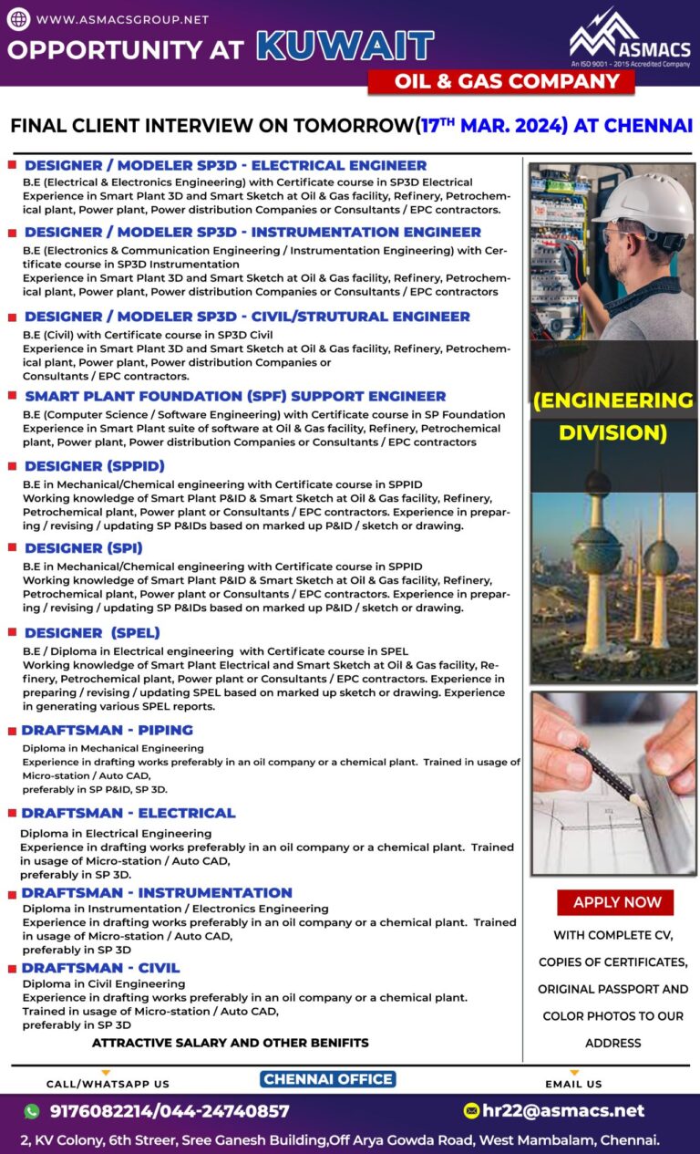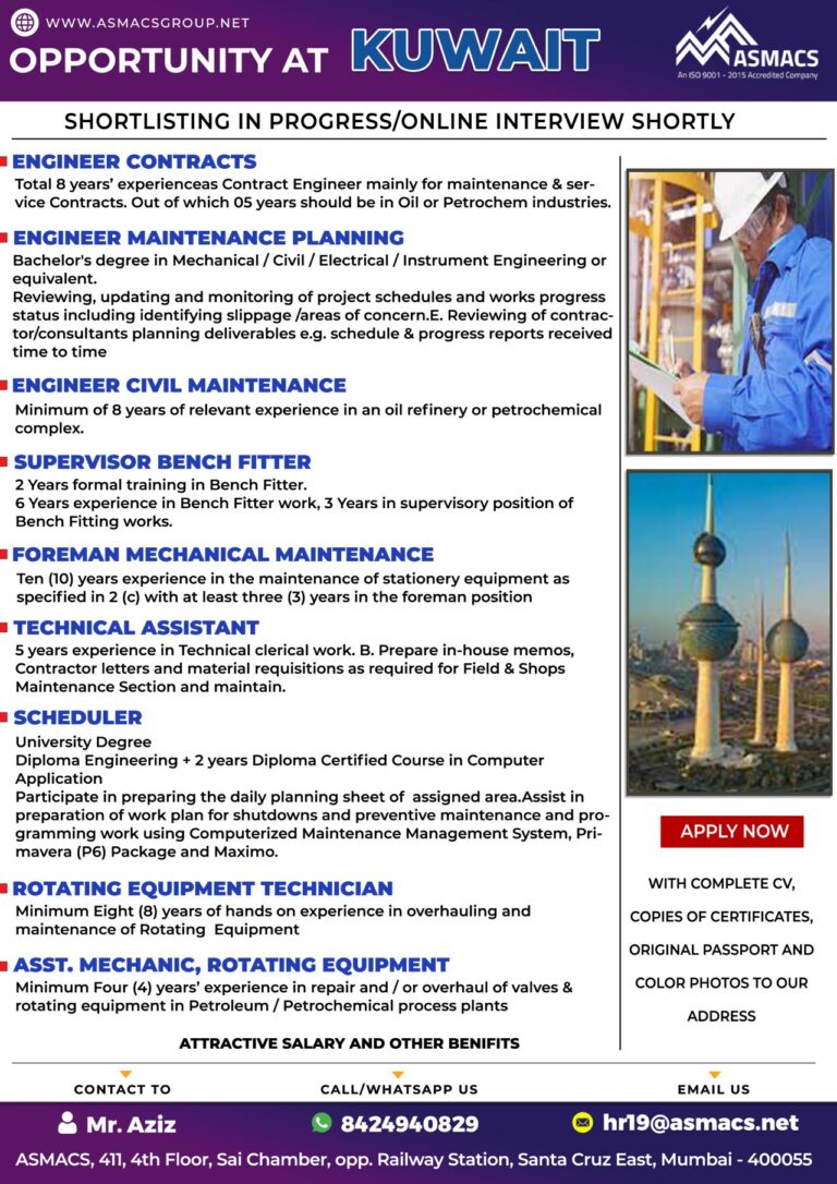 OPPORTUNITY AT KUWAITREPUTED OIL & GAS COMPANYASMACSAn ISO 9001-2015 Accredited CompanyWALKIN FOR SHORTLISTING 02ND & 03RD JUNE 2024FINAL CLIENT INTERVIEW …