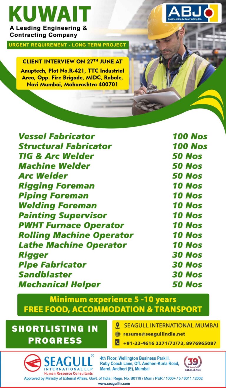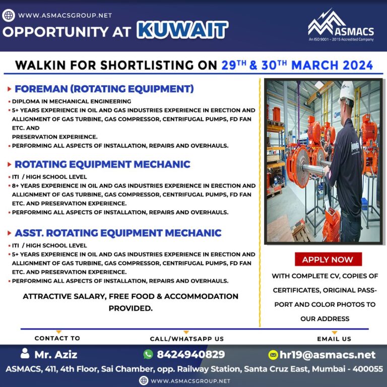 OPPORTUNITY AT KUWAITREQUIRED IN LARGE NO’SWALKIN FOR SHORTLISTING ON 25TH,26TH & 27TH FEB. 2024FINAL CLIENT INTERVIEW AT MUMBAI SHORTLYASMACSAn ISO …