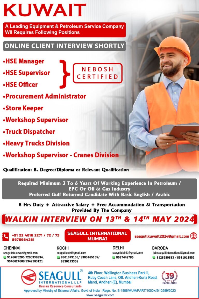 KUWAITA Leading Equipment & Petroleum Service CompanyWII Requires Following PositionsONLINE CLIENT INTERVIEW SHORTLY⚫HSE Manager⚫HSE Supervisor⚫HSE OfficerNEBOSHCERTIFIED•Procurement Administrator⚫Store Keeper•Workshop Supervisor•Truck Dispatcher•Heavy …