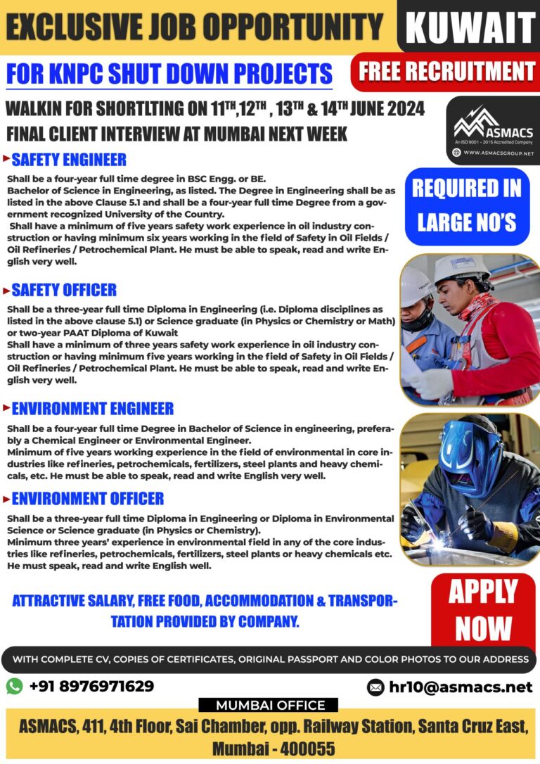 EXCLUSIVE JOB OPPORTUNITY KUWAITFOR KNPC SHUT DOWN PROJECTS FREE RECRUITMENTWALKIN FOR SHORTLTING ON 11TH, 12TH, 13TH & 14TH JUNE 2024FINAL …
