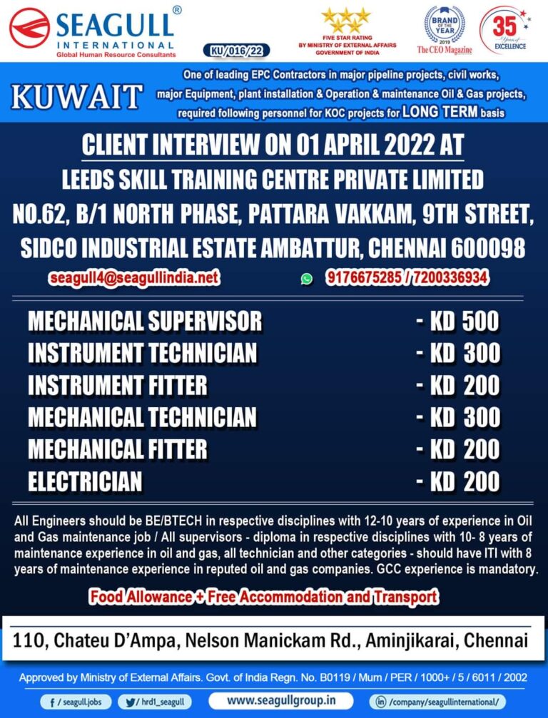 MANPOWER REQUIREMENT FOR A LEADING COMPANY, KUWAITOPERATION & MAINTENANCE DEPARTMENTWALK-IN INTERVIEW ON 29th APRIL 2022 TO 01 MAY 2022 AT …