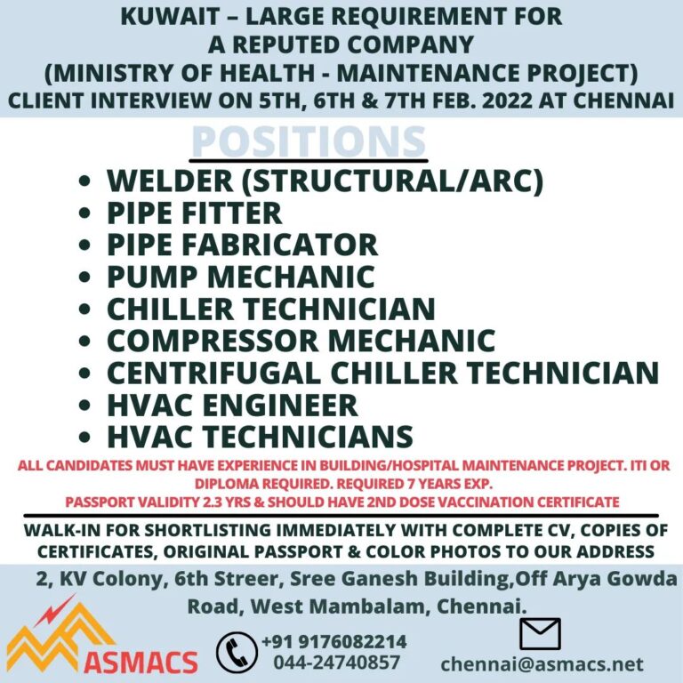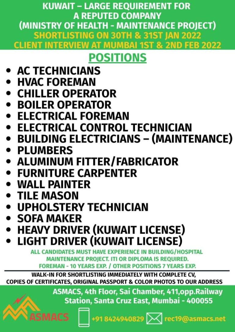 KUWAIT – LARGE REQUIREMENT FORA REPUTED COMPANY(MINISTRY OF HEALTH – MAINTENANCE PROJECT)SHORTLISTING ON 30TH & 31ST JAN 2022CLIENT INTERVIEW AT …