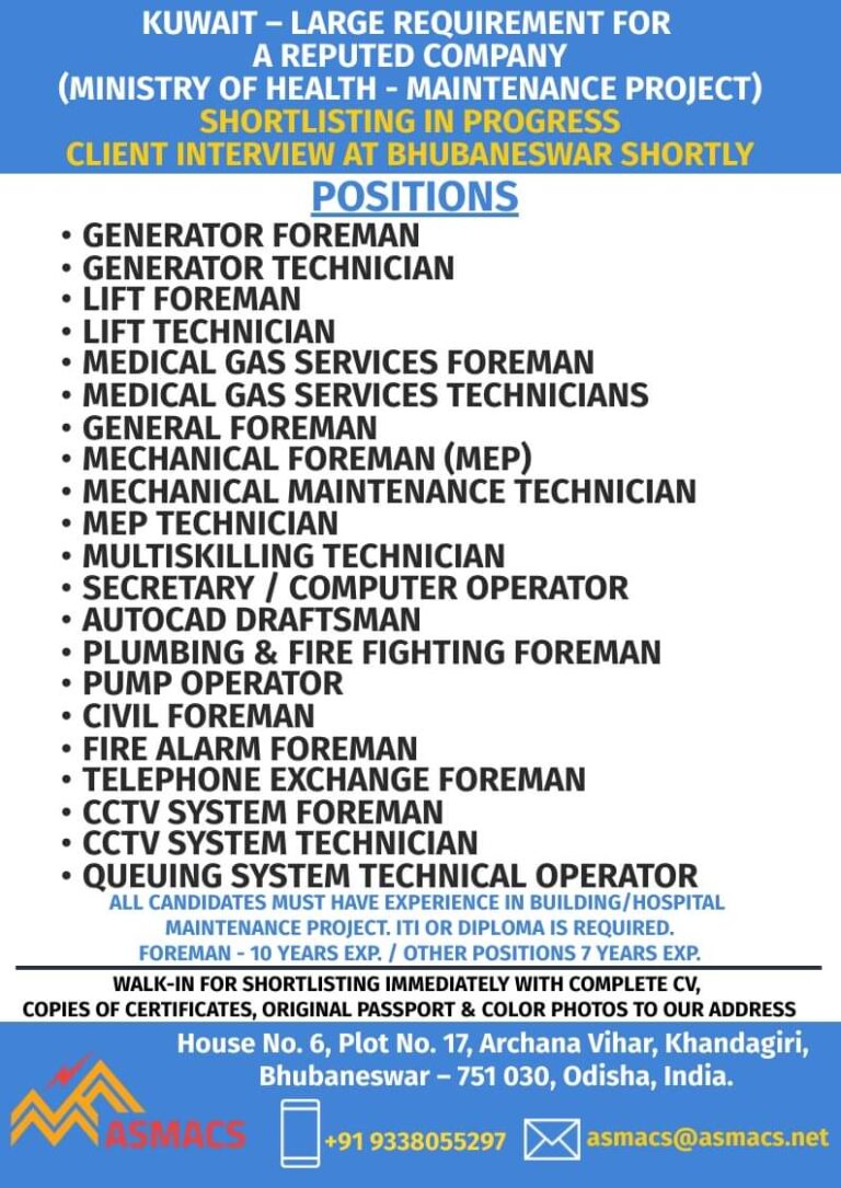 KUWAIT – LARGE REQUIREMENT FORA REPUTED COMPANY(MINISTRY OF HEALTH – MAINTENANCE PROJECT)SHORTLISTING IN PROGRESSCLIENT INTERVIEW AT BHUBANESWAR SHORTLYPOSITIONSGENERATOR FOREMANGENERATOR TECHNICIANLIFT …