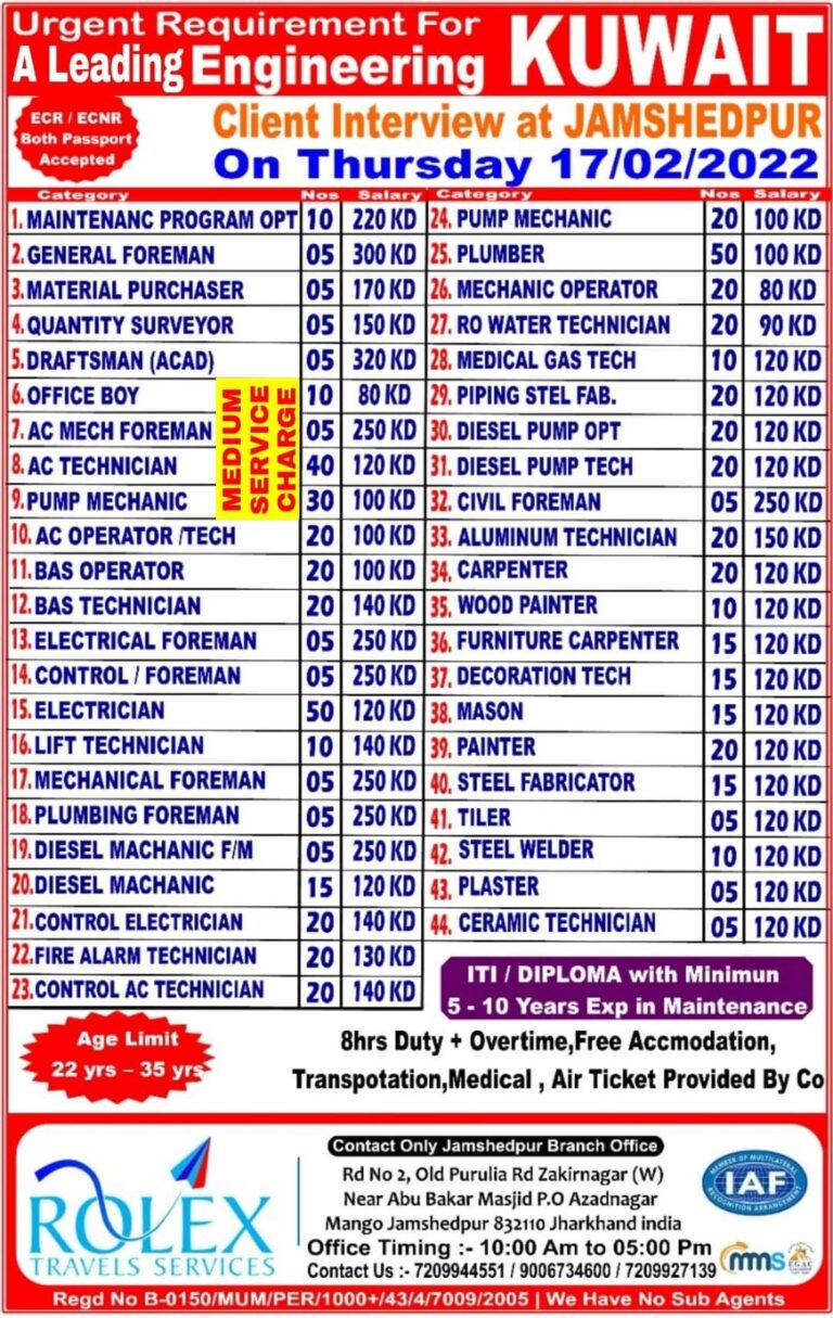 Urgent Requirement For KUWAITA Leading Engineering05 300KD 25. PLUMBERECR ECNRBoth PassportAcceptedClient Interview at JAMSHEDPUROn Thursda 17/02/2022I MAINTENANC PROGRAM OPT 102 …