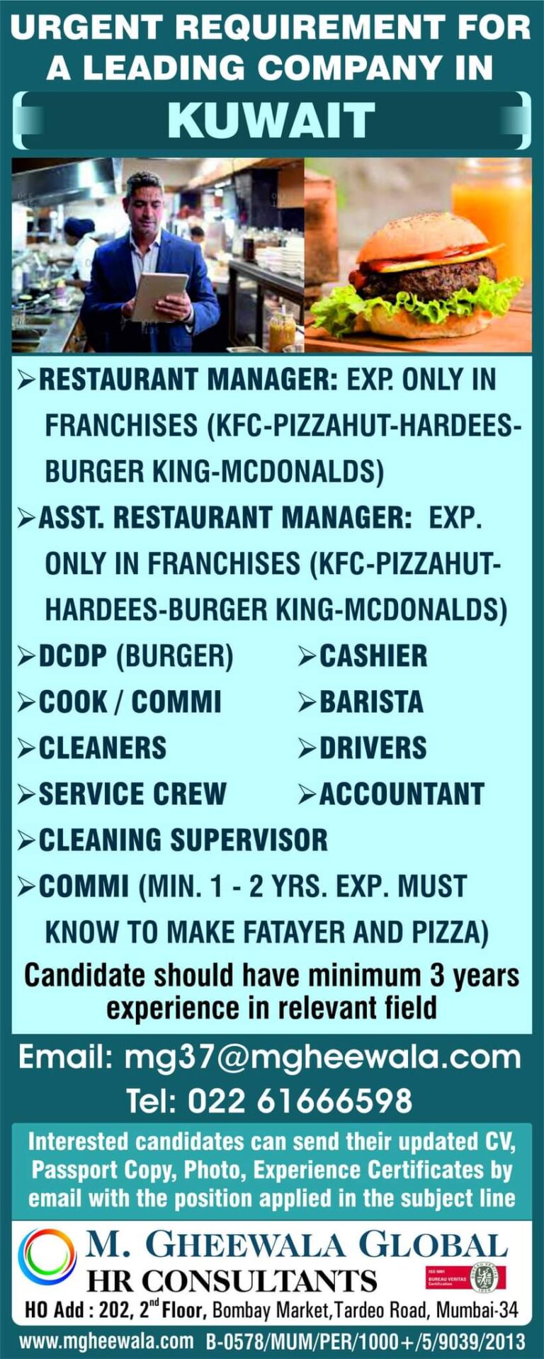 URGENT REQUIREMENT FORA LEADING COMPANY INKUWAIT RESTAURANT MANAGER: EXP. ONLY INFRANCHISES (KFC-PIZZAHUT-HARDEES-BURGER KING-MCDONALDS)ASST. RESTAURANT MANAGER: EXP.ONLY IN FRANCHISES (KFC-PIZZAHUT-HARDEES-BURGER KING-MCDONALDS)DCDP …