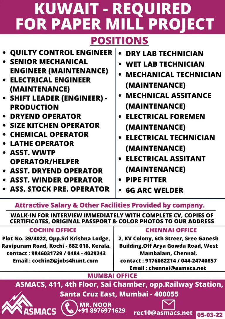 KUWAIT – REQUIREDFOR PAPER MILL PROJECTPOSITIONSQUILTY CONTROL ENGINEER •• SENIOR MECHANICALENGINEER (MAINTENANCE)• ELECTRICAL ENGINEER(MAINTENANCE)SHIFT LEADER (ENGINEER) –PRODUCTIONDRYEND OPERATOR• SIZE KITCHEN …