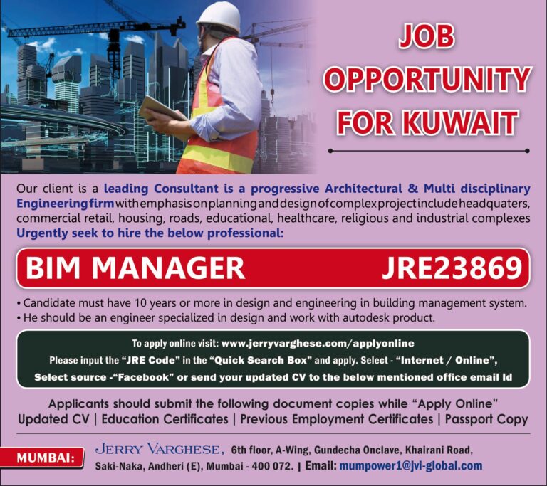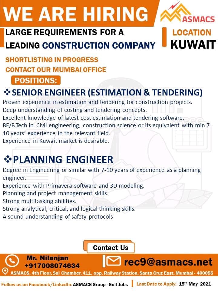LARGE REQUIREMENTS FOR ALOCATIONLEADING CONSTRUCTION COMPANY KUWAITSHORTLISTING IN PROGRESSCONTACT OUR MUMBAI OFFICEPOSITIONS:SENIOR ENGINEER (ESTIMATION & TENDERING)Proven experience in estimation and …