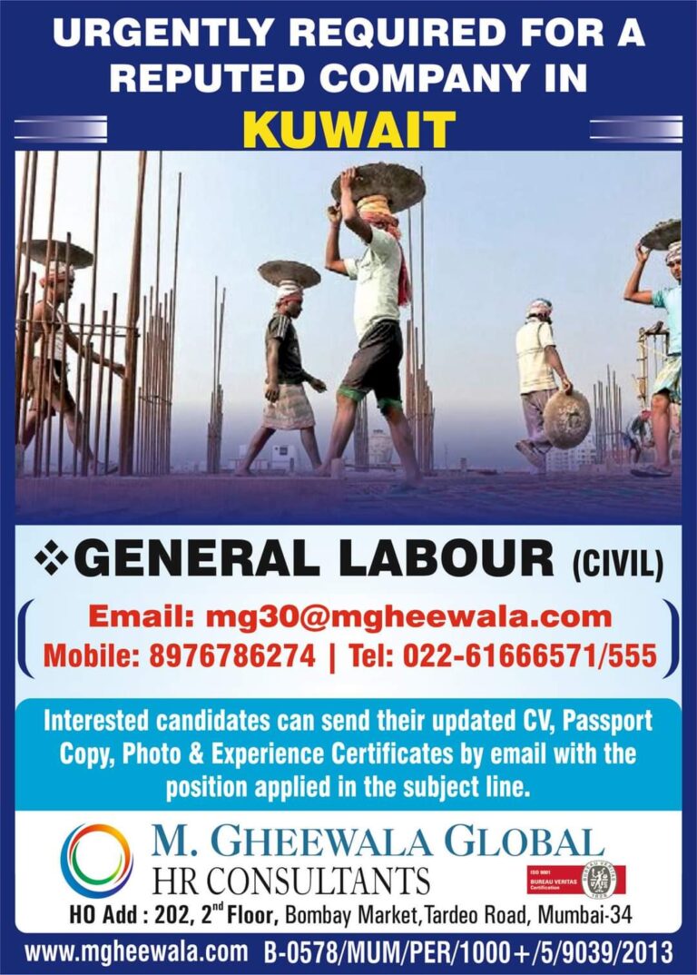 URGENTLY REQUIRED FOR AREPUTED COMPANY IN*GENERAL LABOUR (CIVIL)Email: mg30@mgheewaIaucomMobile: 8976786274 | Tel: 022-61666571/555Interested candidates can send their updated CV, PassportCopy, …