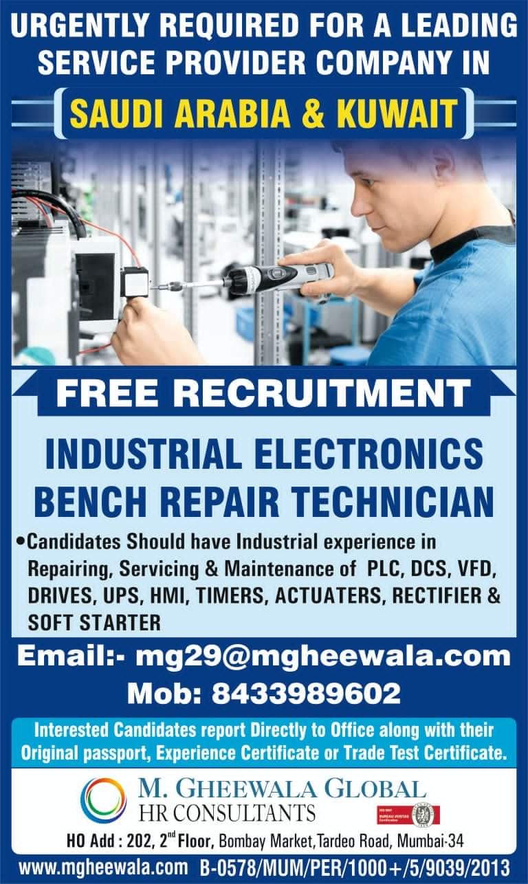 URGENTLY REQUIRED FOR A LEADINGSERVICE PROVIDER COMPANY IN(SAUDI ARABIA & KUWAITFREE RECRUITMENTINDUSTRIAL ELECTRONICSBENCH REPAIR TECHNICIAN•Candidates Should have Industrial experience inRepairing, …