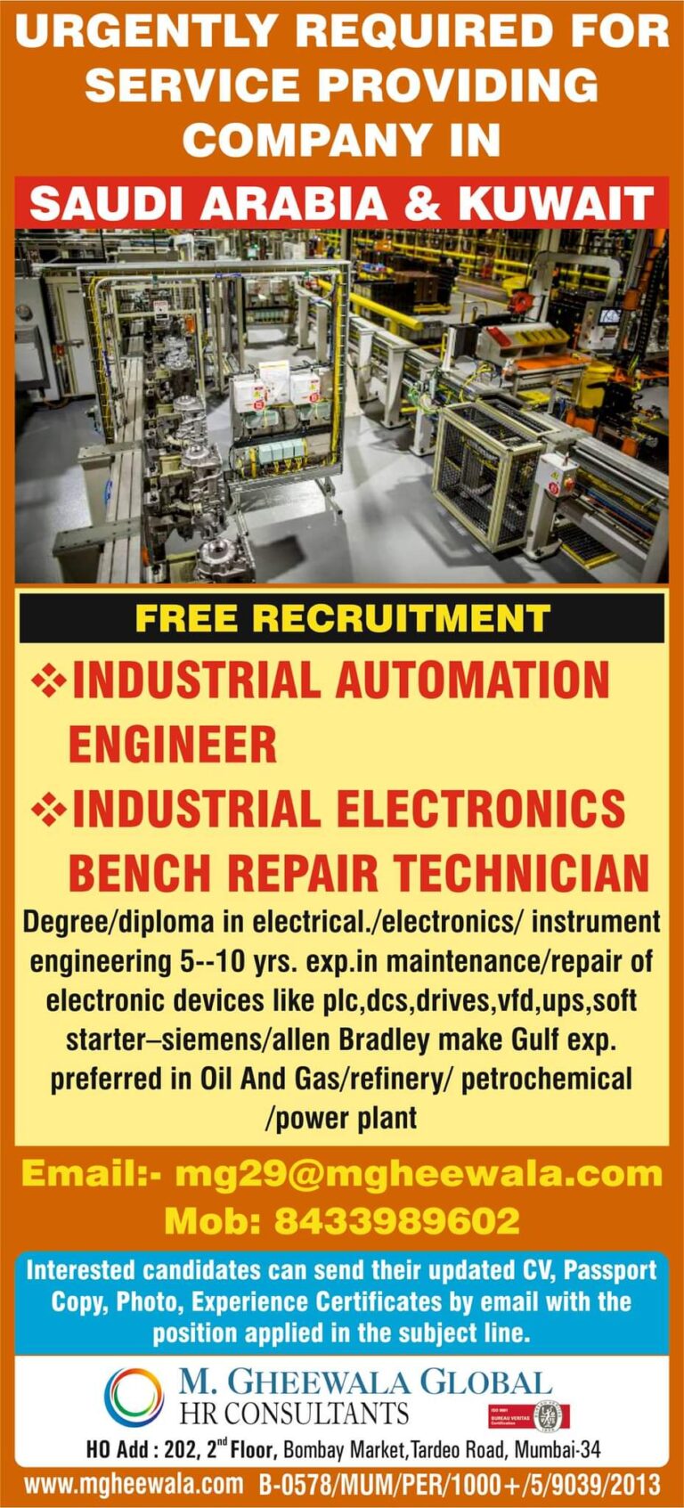 URGENTLY REQUIRED FORSERVICE PROVIDINGCOMPANY IN SAUDI ARABIA & KUWAITFREE RECRUITMENTINDUSTRIAL AUTOMATIONENGINEERINDUSTRIAL ELECTRONICSBENCH REPAIR TECHNICIANDegree/diploma in electrical./electronics/ instrumentengineering 5–10 yrs. exp.in …