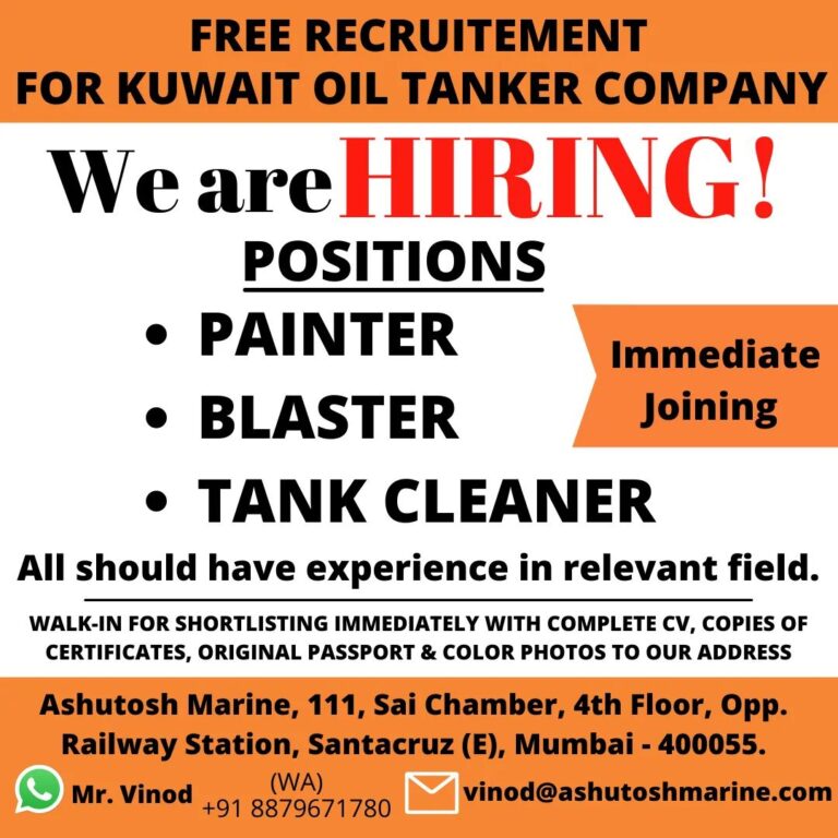 FREE RECRUITMENTFOR KUWAIT OIL TANKER COMPANYPOSITIONS• PAINTERImmediate• BLASTER Joining• TANK CLEANERAll should have experience in relevant field.WALK-IN FOR SHORTLISTING IMMEDIATELY …