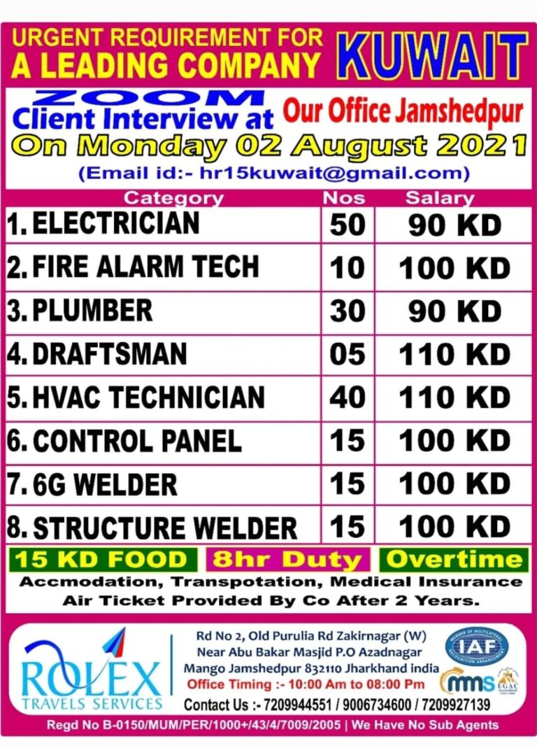 A LEADING COMPANY KUWAITClient Interview at Our Office JamshedpurOn Monday 02 August 2021ZOOM(Email id:- hr15kuwait@gmail.com)CategoryNos Salary ELECTRICIAN50 90 KD FIRE …