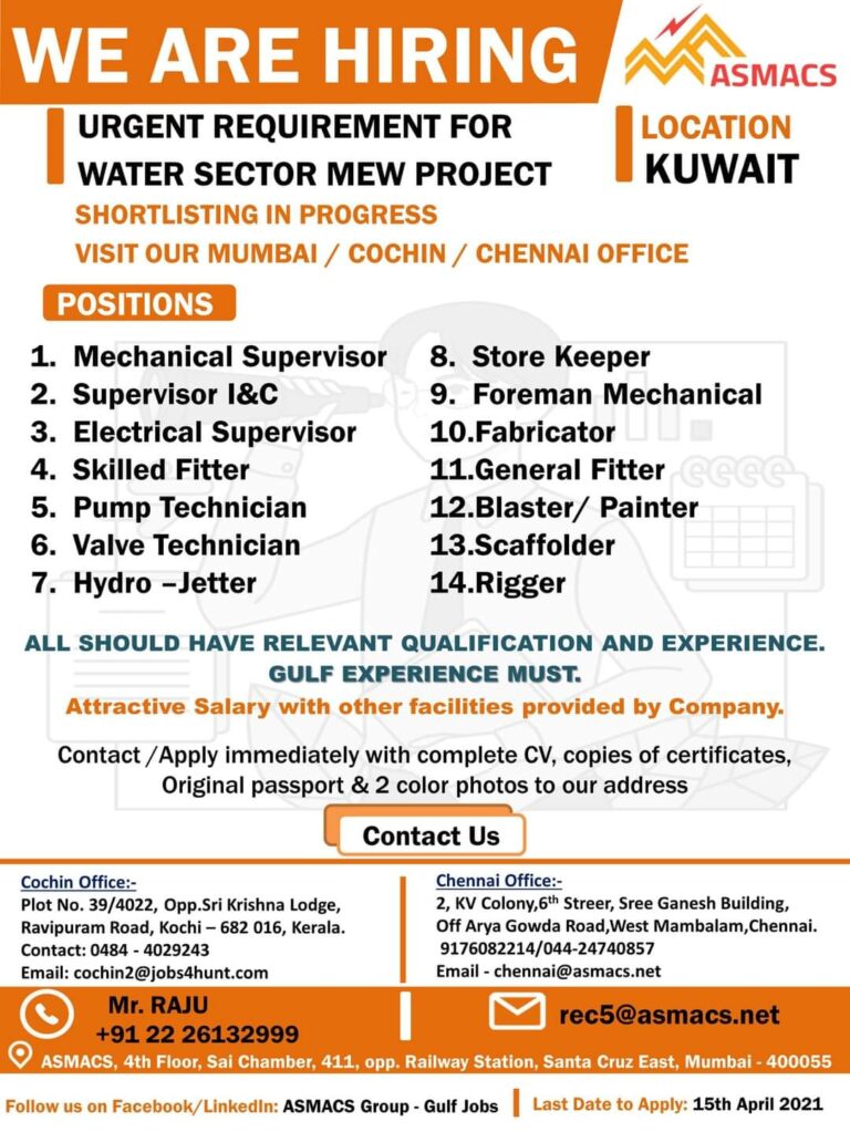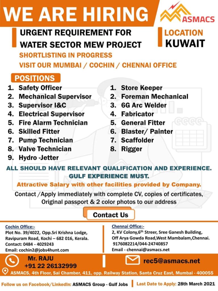 URGENT REQUIREMENT FORWATER SECTOR MEW PROJECTSHORTLISTING IN PROGRESSASMACSLOCATIONKUWAITVISIT OUR MUMBAI / COCHIN / CHENNAI OFFICEPOSITIONSSafety OfficerMechanical SupervisorSupervisorElectrical SupervisorFire Alarm TechnicianSkilled …