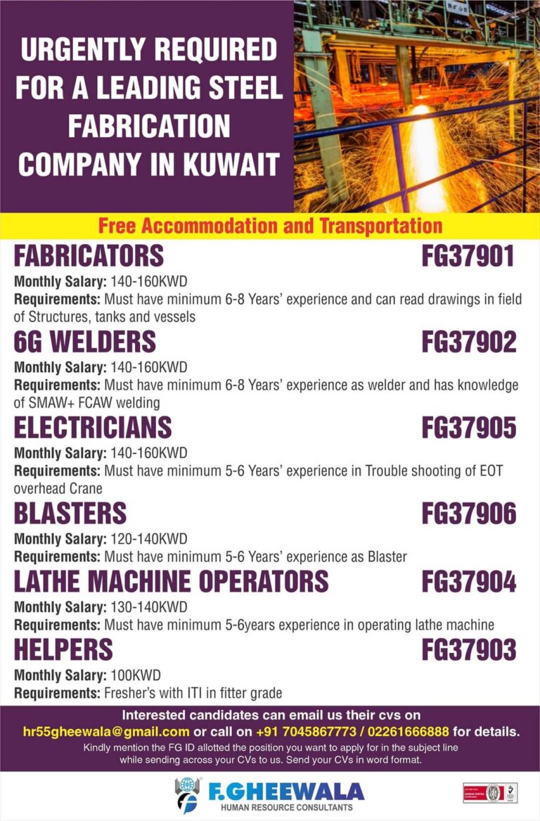 URGENTLY REQUIRED FOR A LEADING STEEL FABRICATION COMPANY IN KUWAITFree Accommodation and TransportationFABRICATORSMonthly Salary: 140-160KWD Requirements: Must have minimum 6-8 …