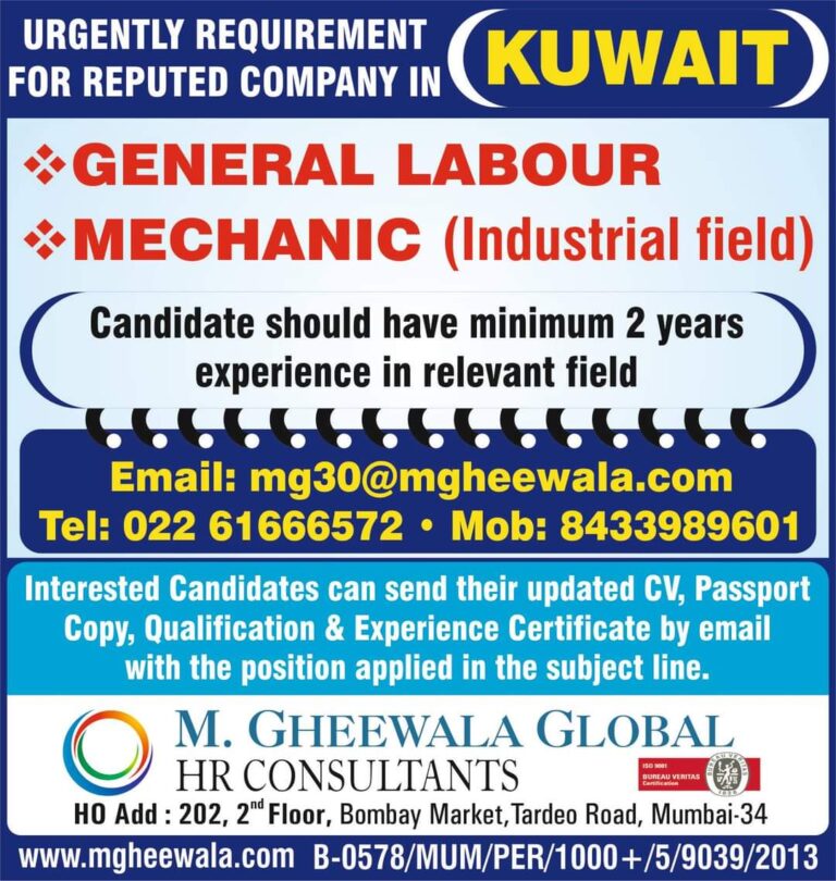 URGENTLY REQUIREMENT KUWAITFOR REPUTED COMPANY IN*GENERAL LABOUR(Industrial field)Candidate should have minimum 2 yearsexperience in relevant fieldEmail: mg30@mgheewaIa.comTel: 022 61666572 • …