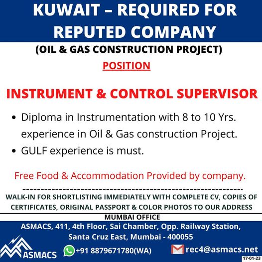 KUWAIT – REQUIRED FORREPUTED COMPANY(OIL & GAS CONSTRUCTION PROJECT)POSITIONINSTRUMENT & CONTROL SUPERVISORDiploma in Instrumentation with 8 to 10 Yrs.experience in …
