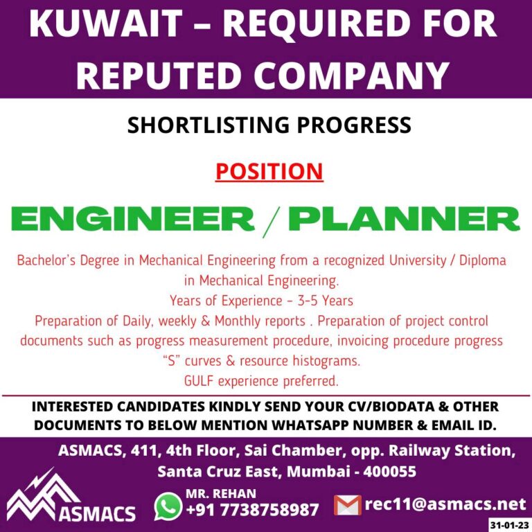KUWAIT – REQUIRED FORREPUTED COMPANYSHORTLISTING PROGRESSPOSITIONENe1NEER PLANNERBachelor’s Degree in Mechanical Engineering from a recognized University / Diplomain Mechanical Engineering.Years of …