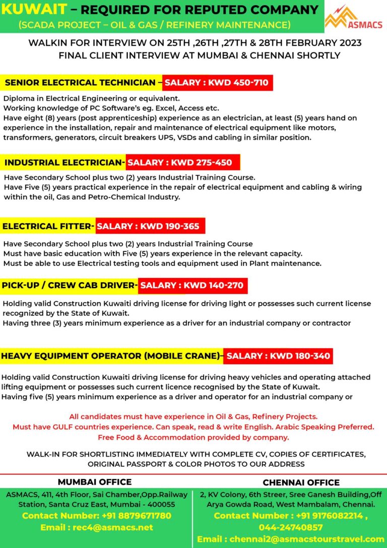 KUWAIT – REQUIRED FORREPUTED COMPANYWALKIN FOR INTERVIEW ON 01ST,02ND & 03RD FEB. 2023POSITIONSHEAVY EQUIPMENT MECHANICHEAVY EQUIPMENT ELECTRICIANAll candidates must have …