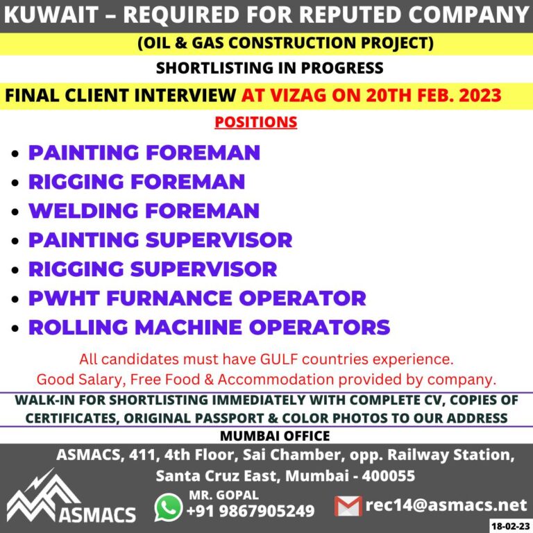 KUWAIT – REQUIRED FOR REPUTED COMPANY(OIL & GAS CONSTRUCTION PROJECT)SHORTLISTING IN PROGRESSFINAL CLIENT INTERVIEW AT VIZAG 0N 20TH FEB. 2023POSITIONSPAINTING …