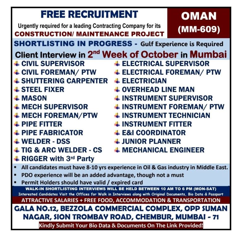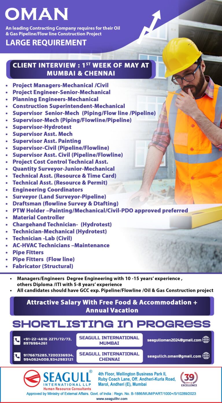 OMANAn leading Contracting Company requires for their Oil& Gas Pipeline/Flow line Construction ProjectLARGE REQUIREMENTCLIENT INTERVIEW: 1ST WEEK OF MAY ATMUMBAI …
